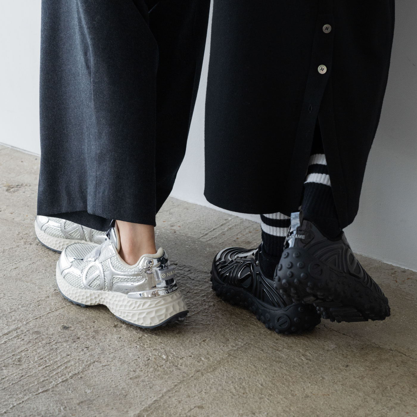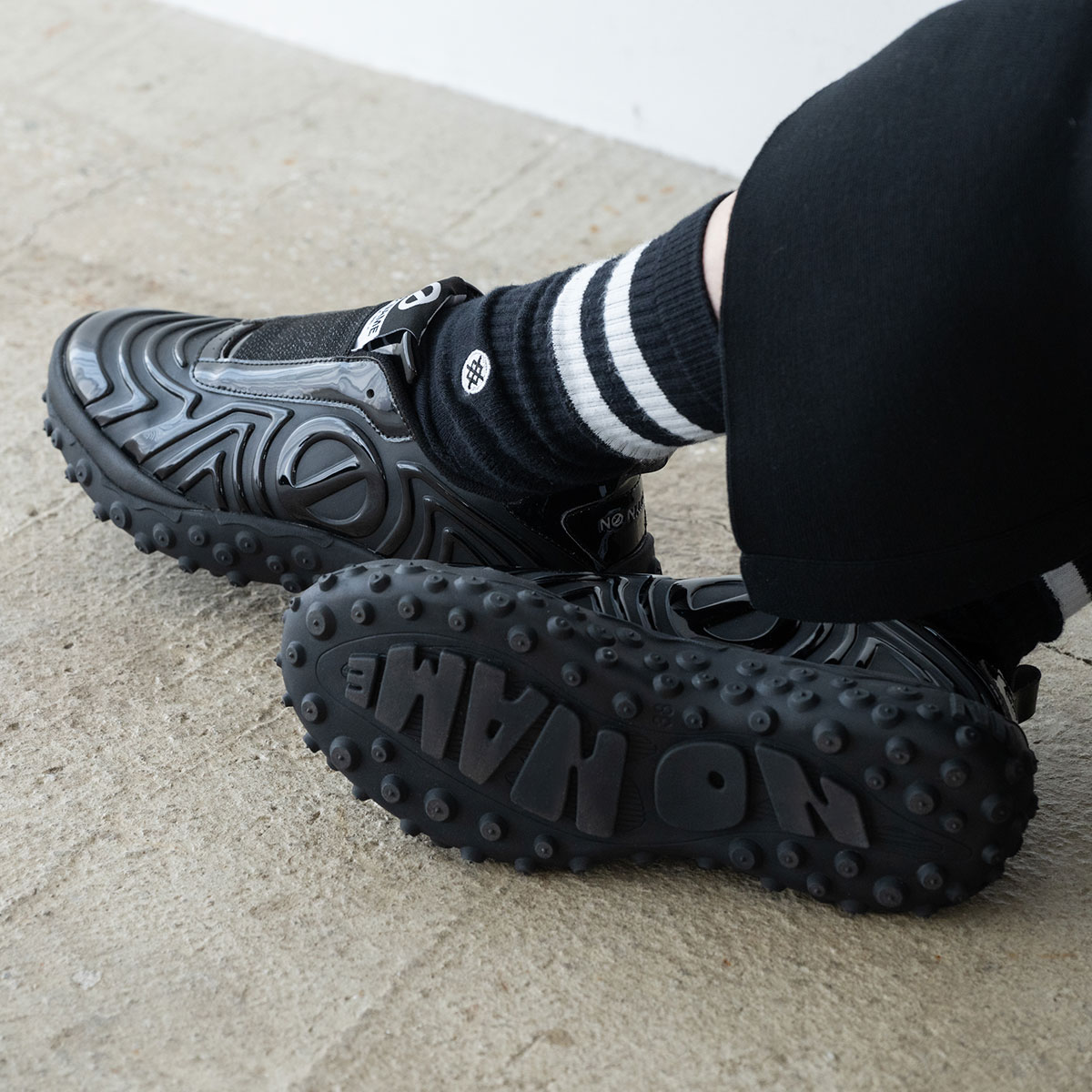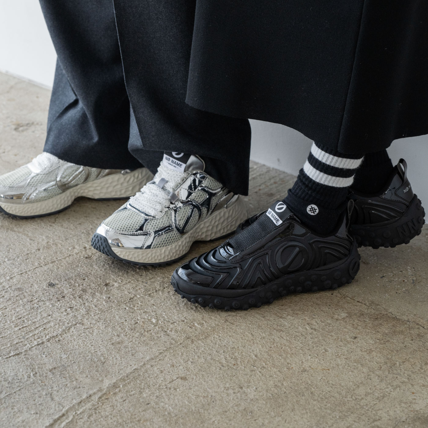 「just shoes」というコンセプトのもとに「名前のない」ブランドとしてスタートし、欧米で爆発的な人気となり社会現象を生み出したフランス生まれのノーネーム。独自のフォルムと厚いソールの絶妙な重量感が快適な履き心地と着用時にヒップラインを美しく見せる効果をあわせ持つことから大人の女性のカジュアルアイテムの代名詞的存在として愛され、支持され続けています。