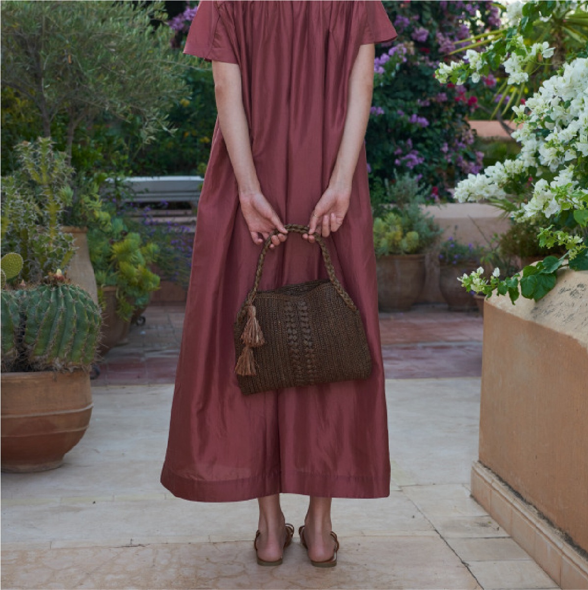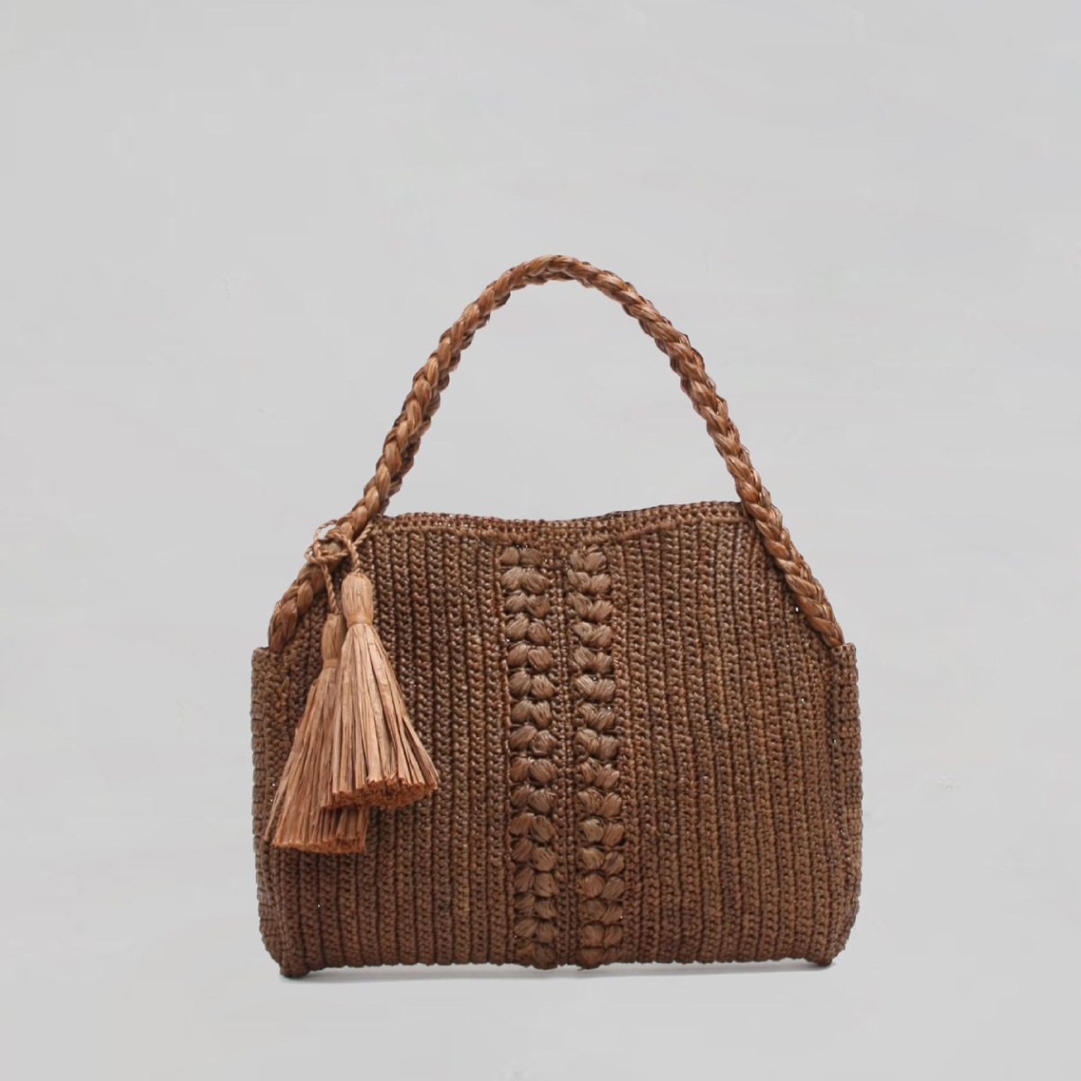 フロントやハンドル部分にあしらわれた三つ編みディテールがアクセントとなり、大ぶりのタッセルが涼しげな印象です。